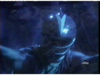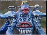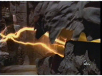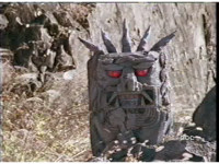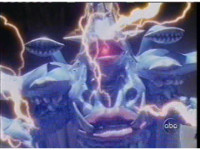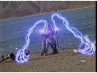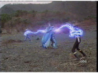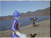 Blue & Black reach the vicinity of the blue pillar, talking to each other then approaching the lake, when they're spark blasted by Mandilok, who walks toward them menacingly. |