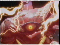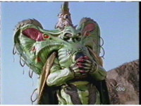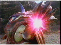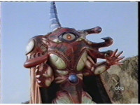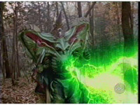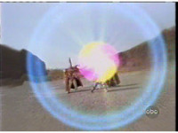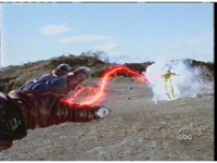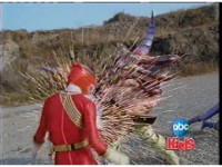 The spiraling ball of energy hits Mandilok, but doesn't explode, Red reacting, as the Org General then flings it back at the Rangers, bursting them all down. |