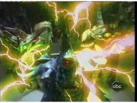 Nayzor fires green electricity at White & Lunar Wolf, bursting them down, as he then approaches, the pair talk to each other a bit, then get up and charge forth. |