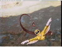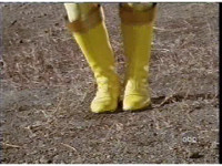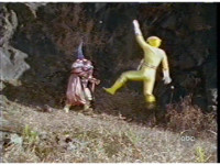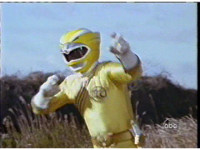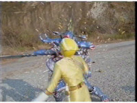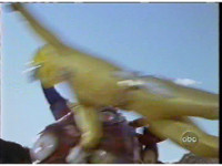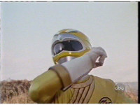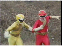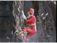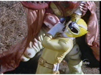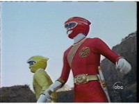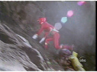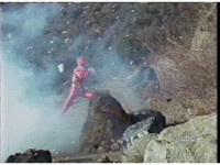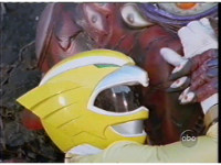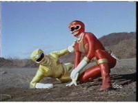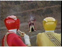 Yellow races at Retinax, who fires a palm-charge forth, smoke & spark bursting her, but still the Ranger dashes on, until she leaps forth and slams the Org General into the rock wall, turning back and talking to Red, who replies, then begins to quickly scale the cliffside. Yellow talks, but is suddenly pushed back by Retinax, who blasts her at close range. Red stops, looks down and talks, Yellow responds, Red replies back, then presses onward. |