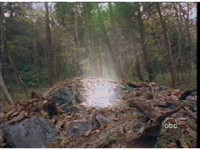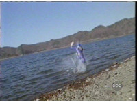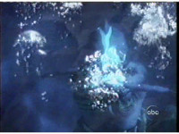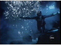 Black sparkily strikes Mandilok repeatedly, then grabs it and lifts it overhead, spinning it around, and talking to Blue, who nods and dashes into the lake. |