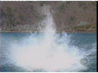 Blue reaches the second pillar totem, he swims at it, and strikes it with his Fighting Fins, causing it to explode and shatter to bits. |