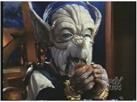 Rita talks happily, Baboo & Squatt watch closely (as does Frankenstein, shh!), as Finster places the pair of shaped Super Putty into the mold press. |