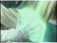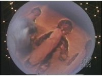 Rita looking at viewers with end of her Repulsascope making her eye look huge. She blinks a few times then looks out, laughing. |
