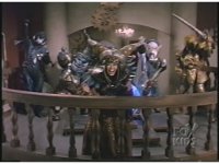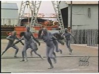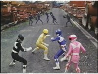 All four Rangers roll left past group of four bladehand Putties, attempt to strike them and fail, only to all get sparkily slashed back at the same time. |