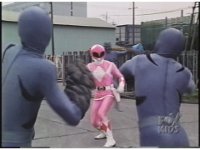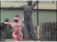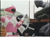 Pink & Black Rangers get sparkily punched in chest by Putty. |
