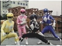 The four Rangers pose with Blasters, then Yellow & Blue turn backs to Black & Pink. |