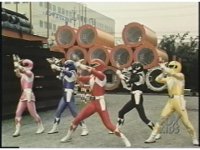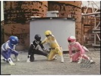 The four Rangers roll off together in zoom out, getting back up in crouches, as Yellow grabs Black's shoulder and points at their enemies. |