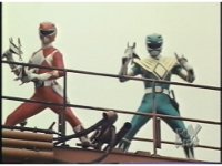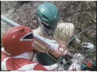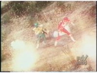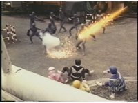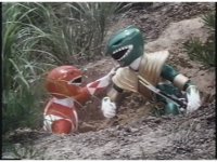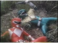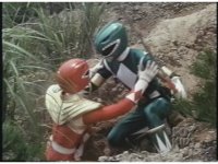 Red and Green Rangers are rushing up hill when four explosions burst around them, knocking them over. |
