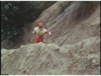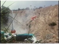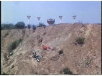 Hitting the bottom, Red & Green writhe for a moment. Red then touches helmet, then turns and talks to Green, prompting him to look up, then point up the hill. Whip pan across to hilltop to circular platform with statues. |