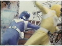 Yellow & Blue Rangers get sparkily punched in chest by Putty. |