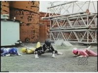 Zoom out as five Putties land in near distance in construction yard, four Rangers see them, then turn around as they approach. |