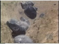 Bunch of big rocks and boulders roll down hill in shaky shot. |