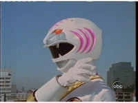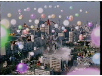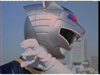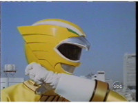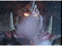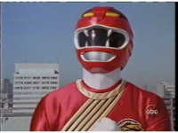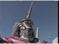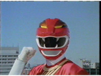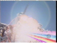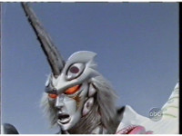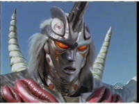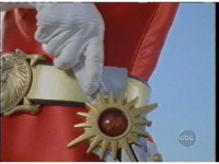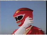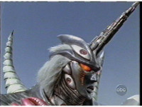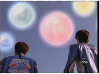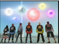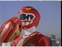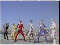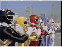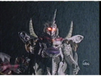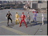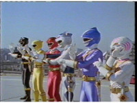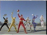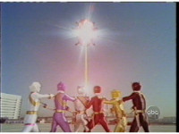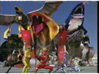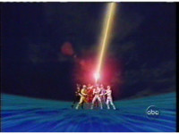 The Rangers step forth, Master Org turns to them, then each Ranger gets to speak, before Red pulls out his Saber, running his hand along the blade, then all of the Rangers grip their Sabers and talk, the weapons glow, and they all fire energy beams forth at Master Org, who bursts. |