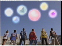 Six glowing orbs hover above the six Rangers, each reflecting a single Wildzord. |