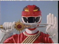 The Rangers lower their Sabers, then Red pulls out his Lion Fang and readies it. |