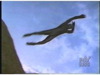 Black Ranger jumps through air, pulling Power Axe over head with both hands. |