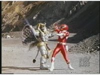 Red Ranger fights King Sphinx in quarry, sword to staff, up close. |
