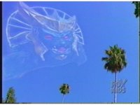 Image of US Goldar's head floats in the sky above the palm trees. |