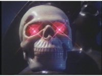 Zoom in real close on skullhead, eyes flashing red three times as lightning flashes. |