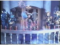 Close on table in front of candle-covered balcony, altar statue with skullhead in between two candelabra, in front of crystal ball. Lightning flashes over the dark scene, skull eyes flash red three times. |