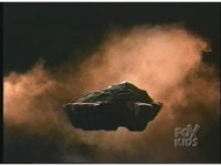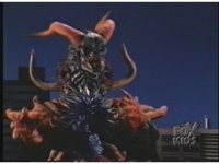 Zoom out from Terror Toad as he fires off a few bolts from his horn, causing sparking bursts at the three Rangers, who leap out of the way. |