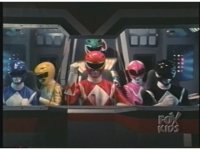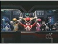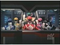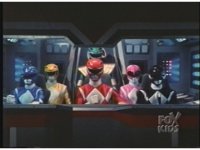 In Megazord cockpit, the six Rangers (Green standing) fade into the scene. |