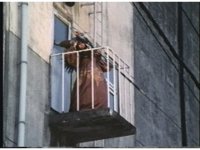 Rita, on fire escape, looks upward with mouth agape, stunned by what she sees. |