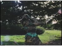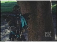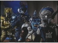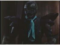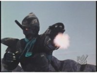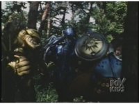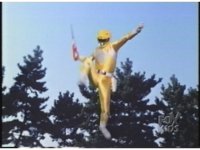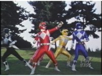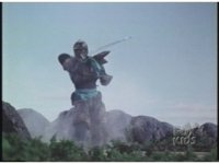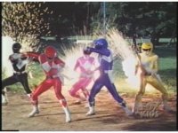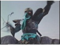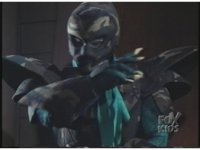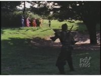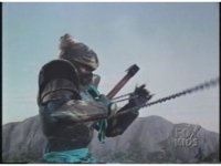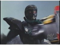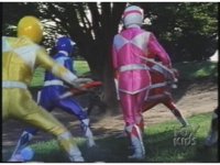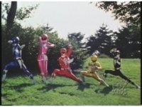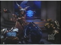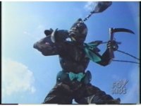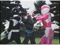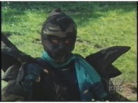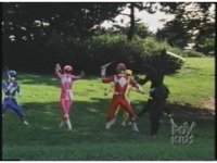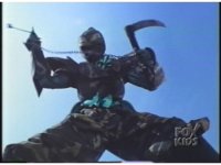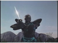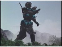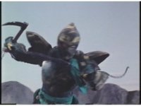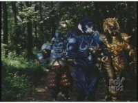 Dark Warrior faces the Rangers in a meadow, katana to Blades. He & Red clash blades, leading to Red rolling away, Yellow dodges, Pink kicks while he sword blocks, Black high kicks over the ducking monster. Dark Warrior turns, sparkily slashes Red, Yellow, kicks Blue then does the same to him. |