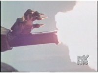 Pan up from Megazord's staggering backward-feet, as it smokes and remains chained. |