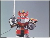 Upward shot, pan up from Megazord's feet, ending on its face, raising sword as camera pans up. |