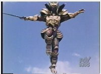 Goldar leaps up with sword, right knee raised, then falls toward camera. |
