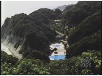 Pan from waves of the ocean over to small resort nestled beside the beach behind a small ridge of hills. |