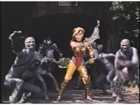 Close on Scorpina as she talks, holds up boomerang, standing in front of Squatt, Baboo, and Rockstar. Zoom out before group of Putties magically appear out of thin air around her, and rush forth when she gestures weapon forth. |