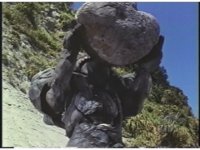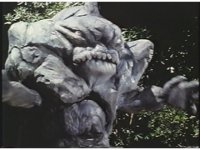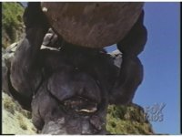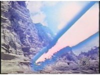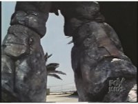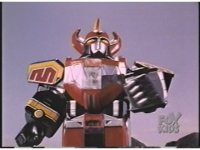 Upward shot, pan up from Megazord's feet, ending on its face, lowering sword as camera pans up. |