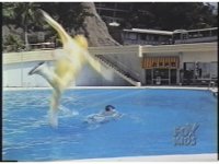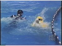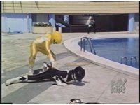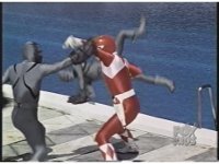 Red Ranger has just pushed Putty into pool and turns to block punch by another, before grabbing its arm and flipping it over. |