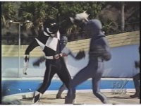 Black Ranger kicks Putty then shoves it aside, blocks another's arm, then grabs its crotch and flings it into the pool. |