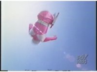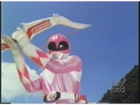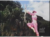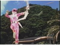 Pink Ranger leaps up to our left in side angle firing arrow from Power Bow. |