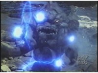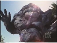 Putty stands frozen as blue beam shines through him, causing him to burst with sparks and crumble into pieces. |