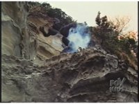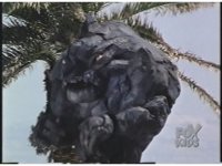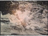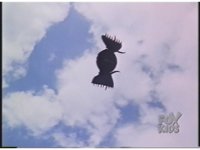 Pterodactyl Dinozord flies out of the smoking volcano and disturbs trees upon reaching them. |