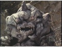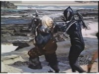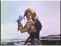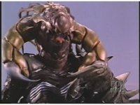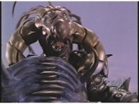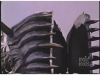 Close on Goldar as he raises sword over right shoulder in a brief pose before slashing at the screen. |