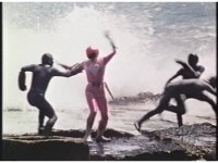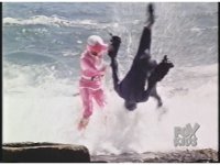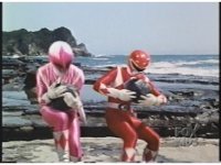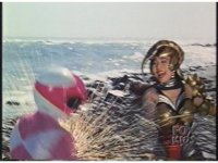Zoom out as Pink crashes into the sand, the other four Rangers regrouping around her. |