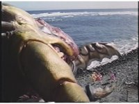 Giant monster Scorpina looms with her big claw over tiny Rangers on the beach. |