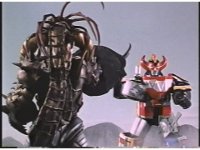 Goldar grabs Megazord at sword-point and holds it facing forward in zoom in. |