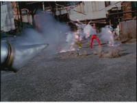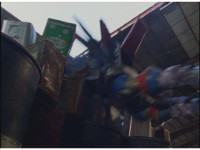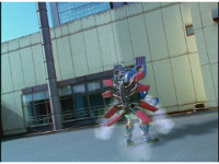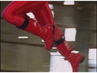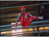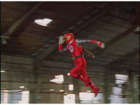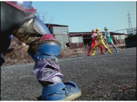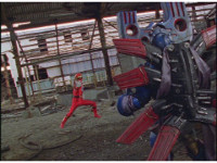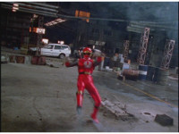 The Rangers cease posing and talk at the monster, Red then gesturing his hands together, and leaping up and running through the air, before finally kicking forth, and kicking into Mad Magnet repeatedly, until the monster is flung out of the warehouse, though he lands safely, the three Rangers then flipping out after him. |