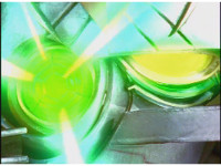 Red raises his left arm while speaking, and pulls off the disc on his Morpher, sticks it in a slot, pulls a lever, and the disc slides down. Yellow & Blue then do the exact same things. |