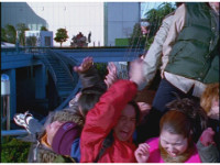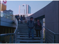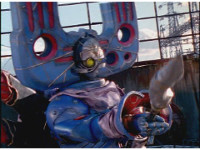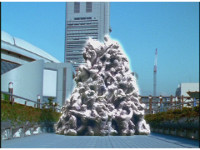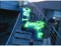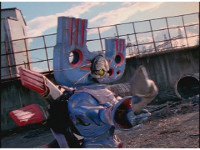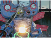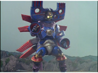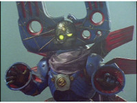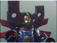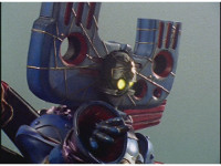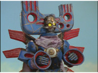 Mad Magnet walks forth and stops in view of some Japanese civilians on an outside stairway, the monster talks, then gestures his hands together, and fires some electricity at the civilians, polarizing them in pairs, causing them to connect together, back to back, before they all go flying through the air into big lumps of multiple struggling Japanese people. Mad Magnet then gestures and fires beams of rings from his ears, which solidifies the lumps of people into statues. |
