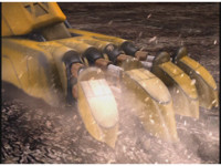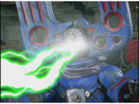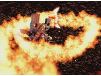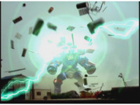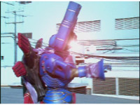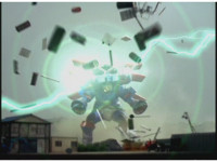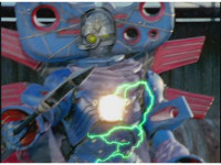 Mad Magnet leans down and fires beams at the ground, sending metal debris flying forth at the Storm Megazord, which marches forth despite bursts and explosions erupting about, Mad Magnet then reacting. |