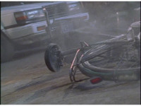 The girder and bicycle fall off of Red, releasing him so he can get up off the car. |