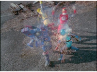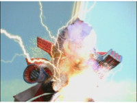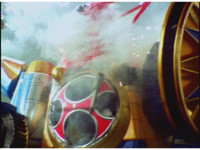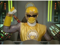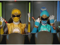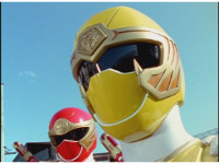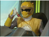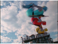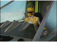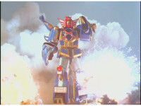 On his viewscreen, Blue talks to Yellow, the transmission then switching to Red who also speaks, Yellow responds by waving to them, before flexing his right arm, then pressing a button, causing Lionzord to fart steam, sending it flying forth, flying through the tunnel of wind and rocks over the mountains, heading straight for Mad Magnet, sparkily slamming into him, causing the monster to stagger back and explode into a rain of debris. The Rangers cheer, which transitions into the three Zords coming to a stop near one another. |